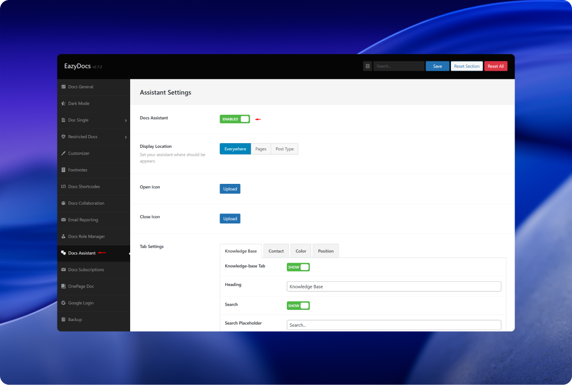 Enable and fully configure your integrated docs assistant with ease. Control exactly where it appears by setting the display location across your pages. You can also customize its appearance with unique open and close icons, and precisely adjust its vertical and horizontal position for optimal user support and visibility.