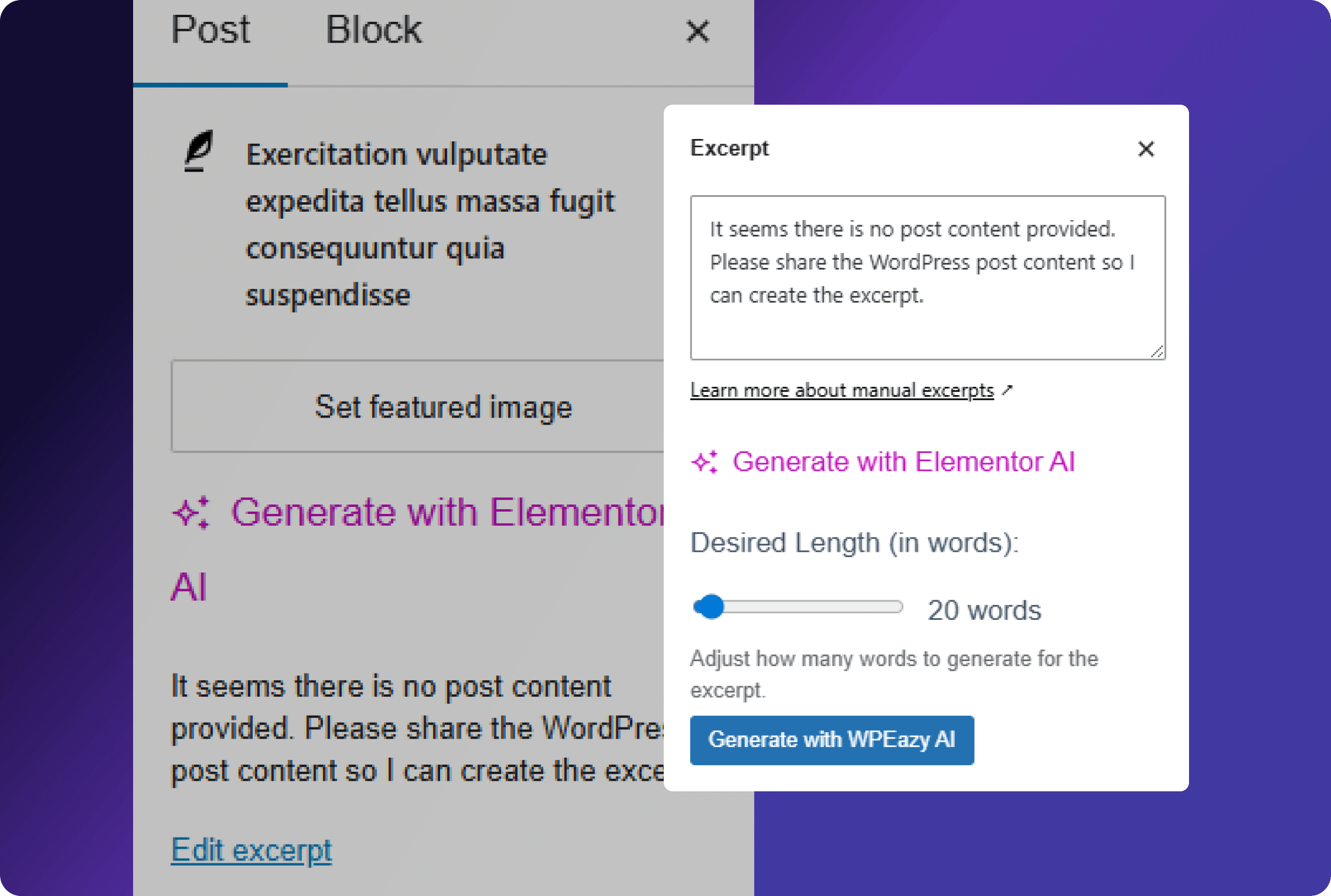 Use Elementor AI to bypass manual excerpt writing. Simply share your WordPress post content, select your desired length, and instantly generate a concise summary. Save time and keep your post previews consistent.