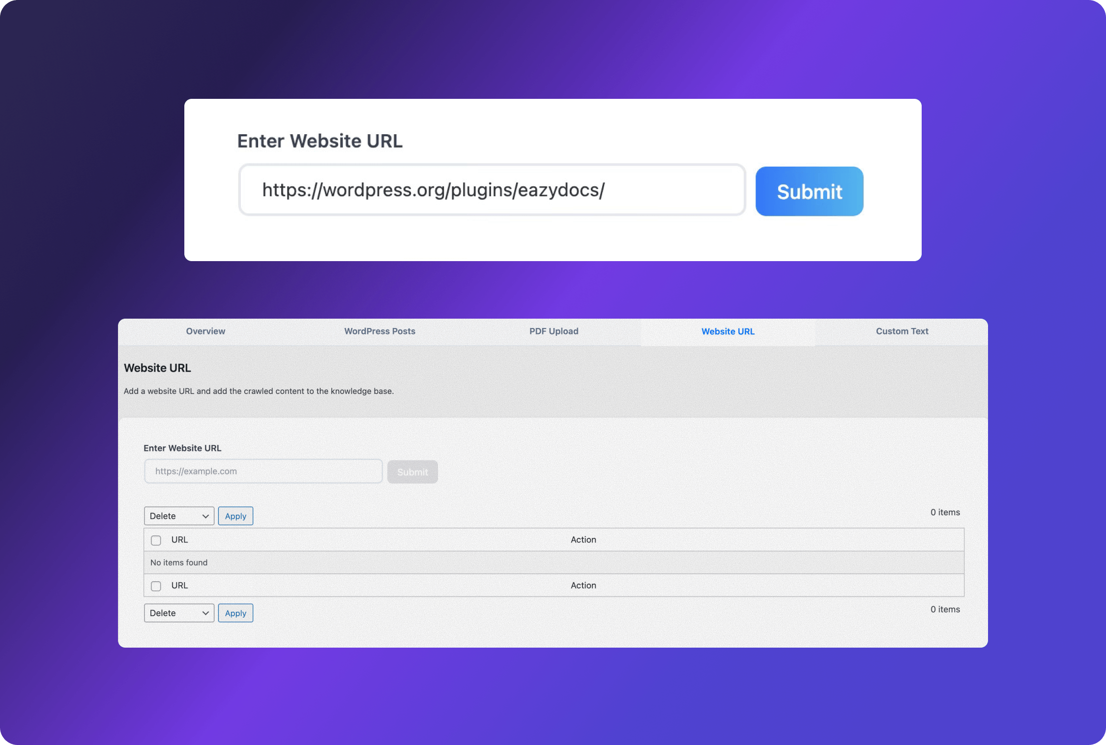 Skip the tedious manual data entry. Simply provide a public web URL, and our system does the work, letting the AI learn from the content. It’s the fastest, easiest way to keep your AI’s knowledge base accurate and completely up-to-date with your website.
